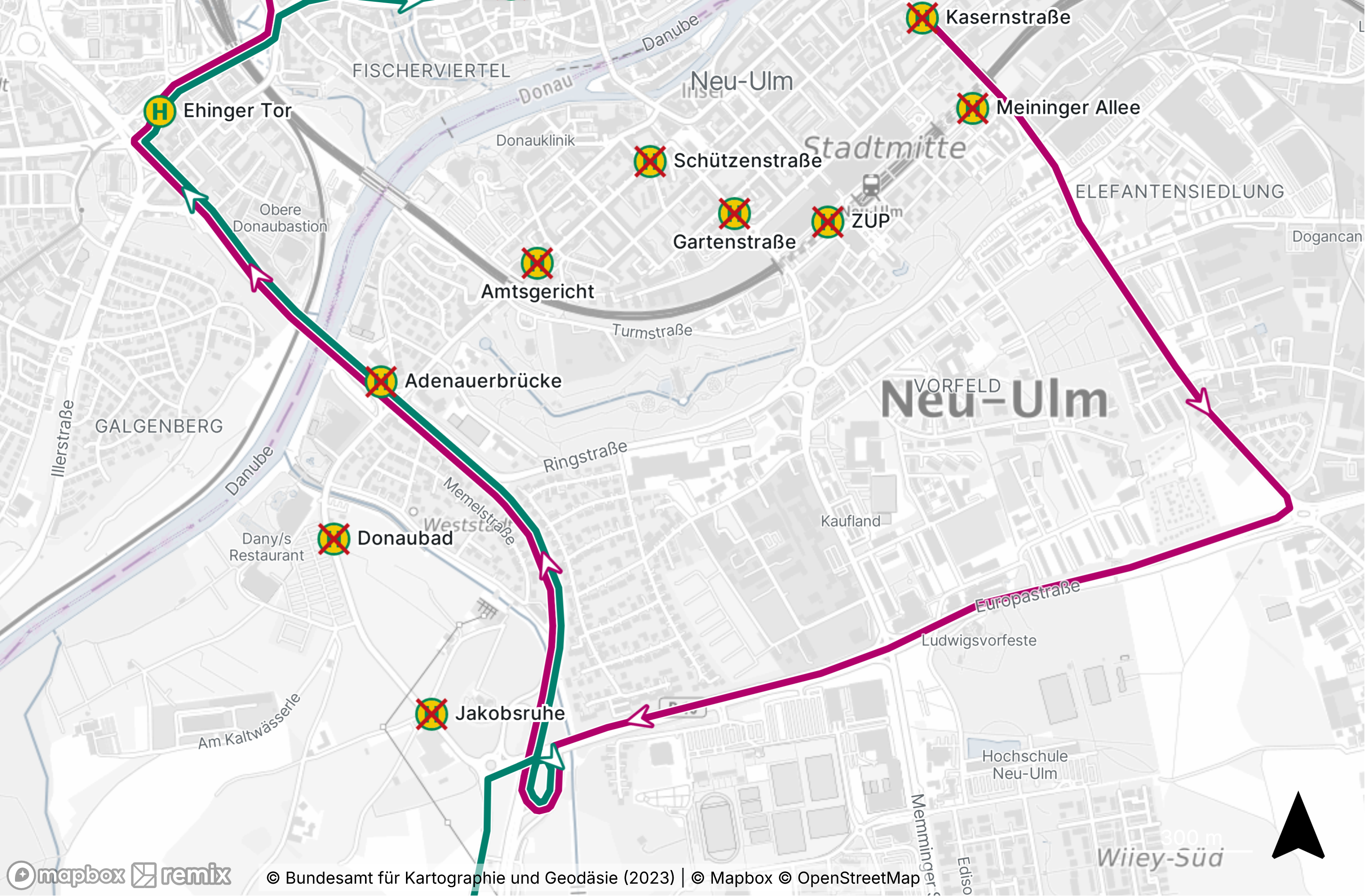 Linien 4 und N7 Ri. Böfingen Süd bzw. ZOB: Umleitung zwischen Illerbrücke und Ehinger Tor. Die Haltestellen Jakobsruhe, Donaubad und Adenauerbrücke entfallen.