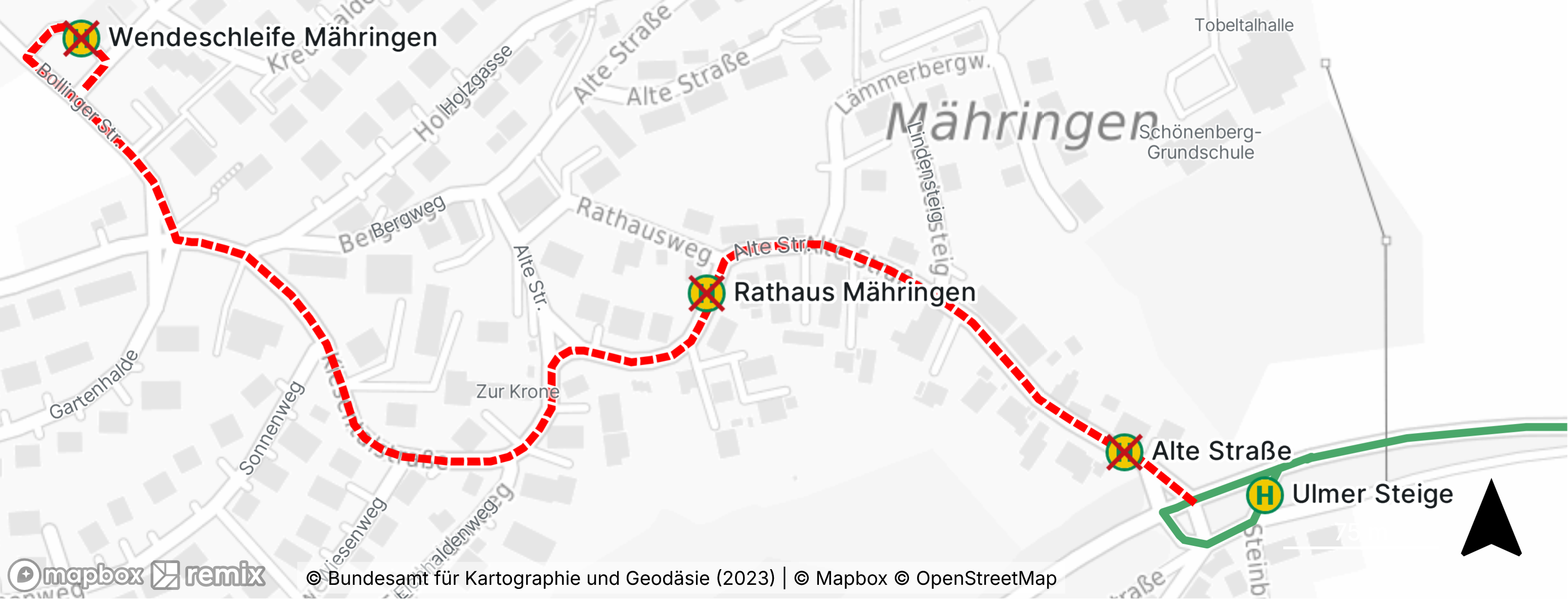 Die Linie beginnt und endet an der Haltestelle Ulmer Steige. Die Haltestellen Alte Straße, Rathaus Mähringen und Wendeschleife Mähringen entfallen.
