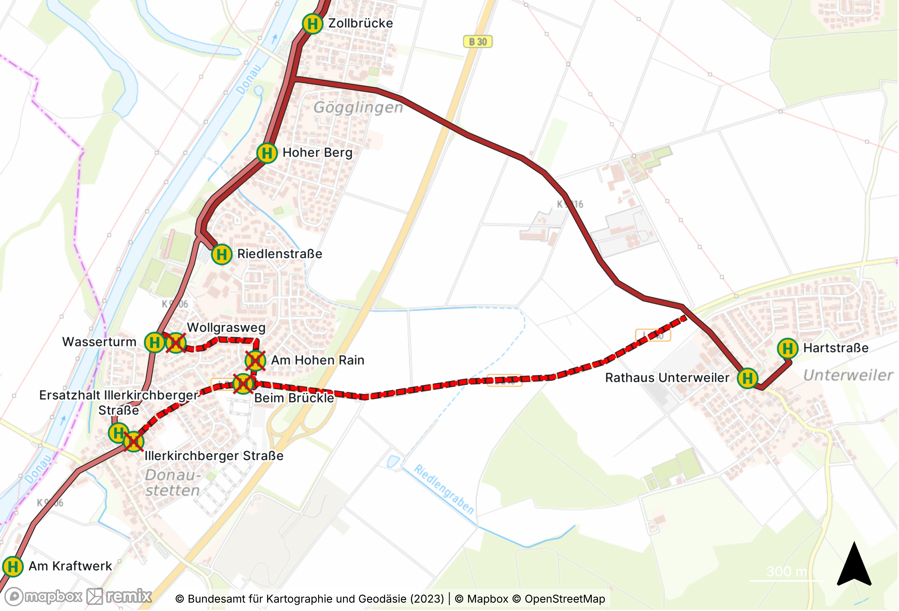 Umleitung zwischen Riedlenstraße und Rathaus Unterweiler ohne Zwischenhalt. Die Haltestellen Wasserturm, Illerkirchberger Straße und Beim Brückle entfallen.