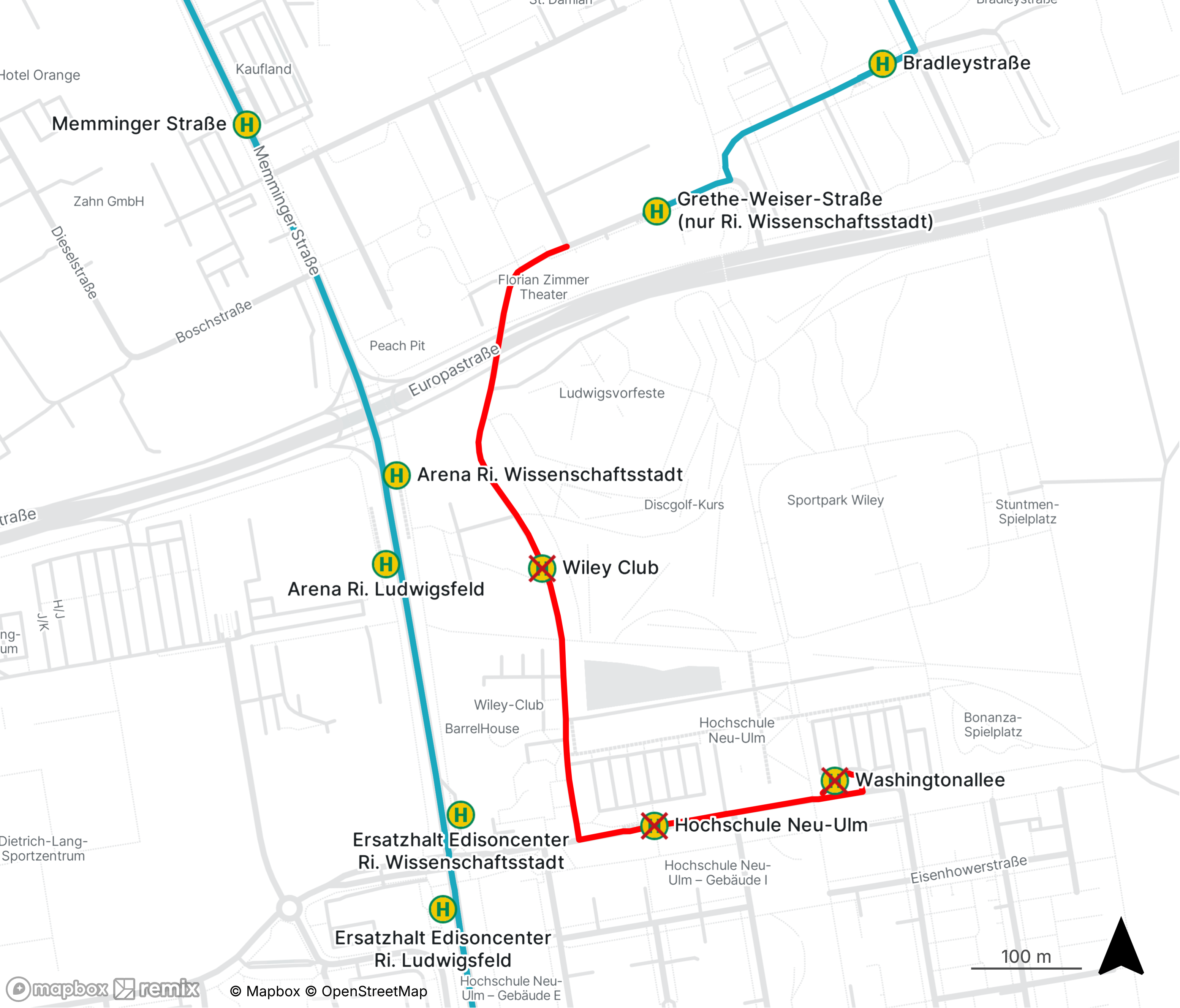 Die Haltestellen Grethe Weiser Straße (Ri. Wiley), Wiley Club, Hochschule Neu-Ulm und Washingtonallee können nicht bedient werden.