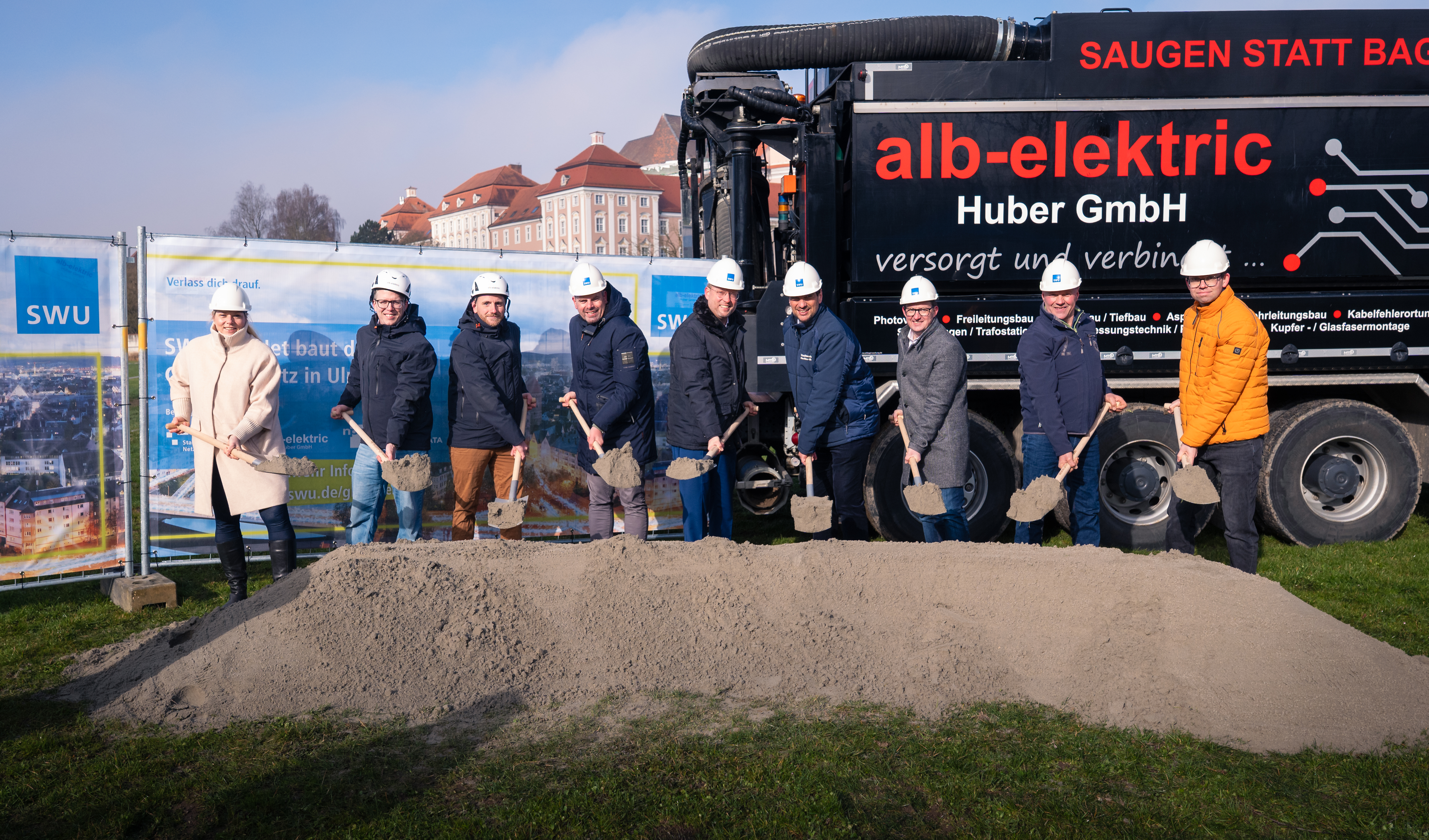 Beim Ausbau kommt auch moderne Spezialtechnik zum Einsatz. So setzt die alb-elektric Huber GmbH unter anderem einen Saugbagger ein, der besonders präzise Arbeiten im Bereich bestehender Leitungen ermöglicht und gleichzeitig schonend in Grünflächen sowie im Wurzelbereich von Bäumen eingesetzt werden kann. Statt klassischem Aushub wird das Erdreich dabei mit starker Saugtechnik punktgenau entfernt. Die Funktionsweise ähnelt dem Prinzip eines überdimensionierten Staubsaugers. Dadurch lassen sich Kabel und Versorgungsleitungen schonend freilegen und Bauarbeiten auch in engen innerstädtischen Bereichen effizient durchführen.